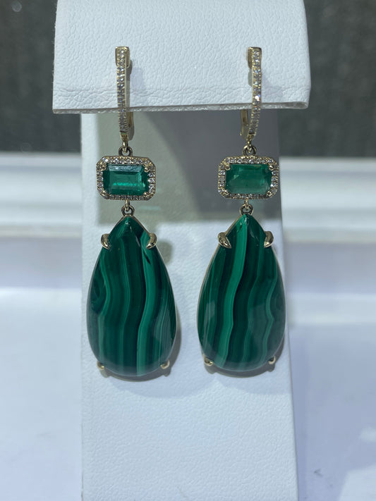 Malachite and Emerald Diamond Drop Earrings Set in 14K Yellow Gold