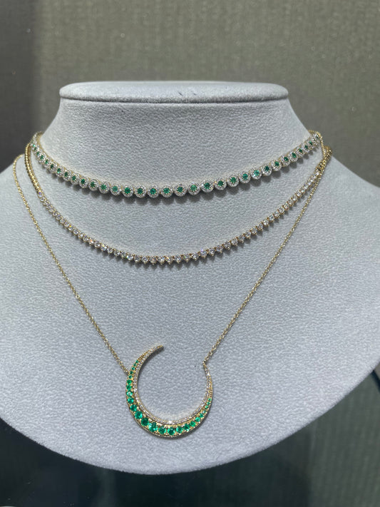 14KT Yellow Gold Emerald Crescent Moon Pendant with Diamonds