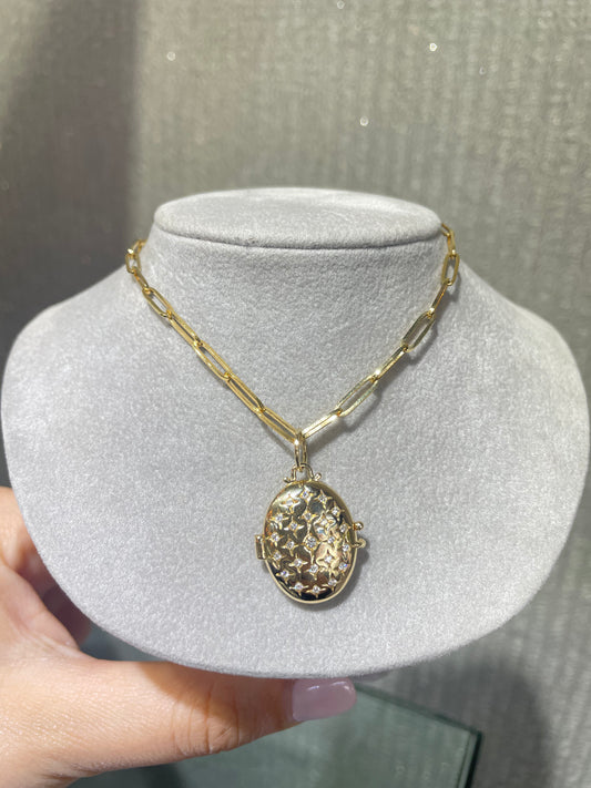 14K Yellow Gold Locket with Diamond Stars and Paperclip Chain