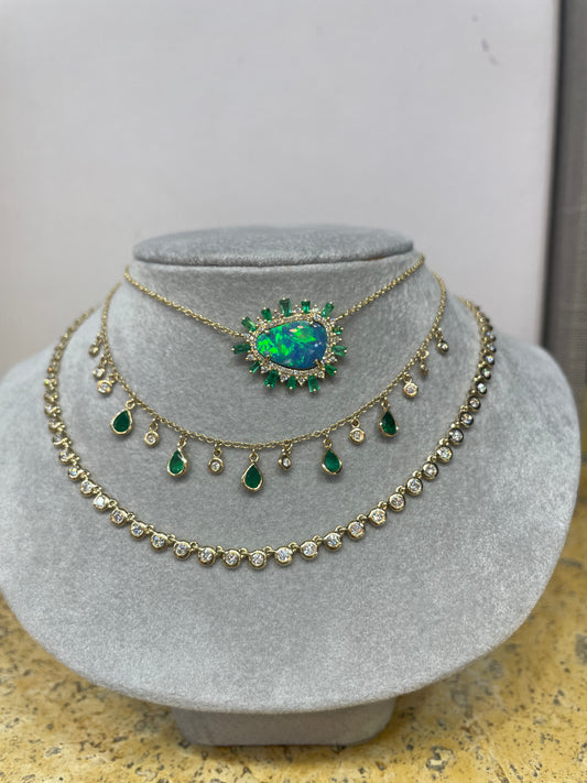 14K Yellow Gold Opal Stone with Diamond and Emerald Surrounding Necklace